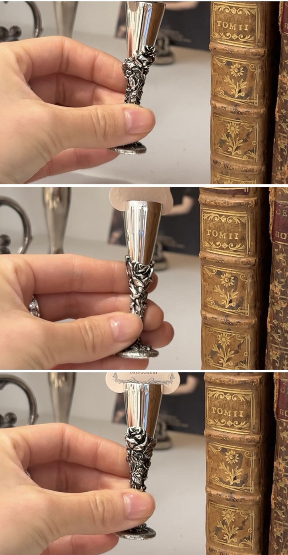 로맨틱한 장미 덩쿨이 리듬감 있게 둘러진 빈티지 실버도금 미니 촛대겸 메모홀더 입니다.