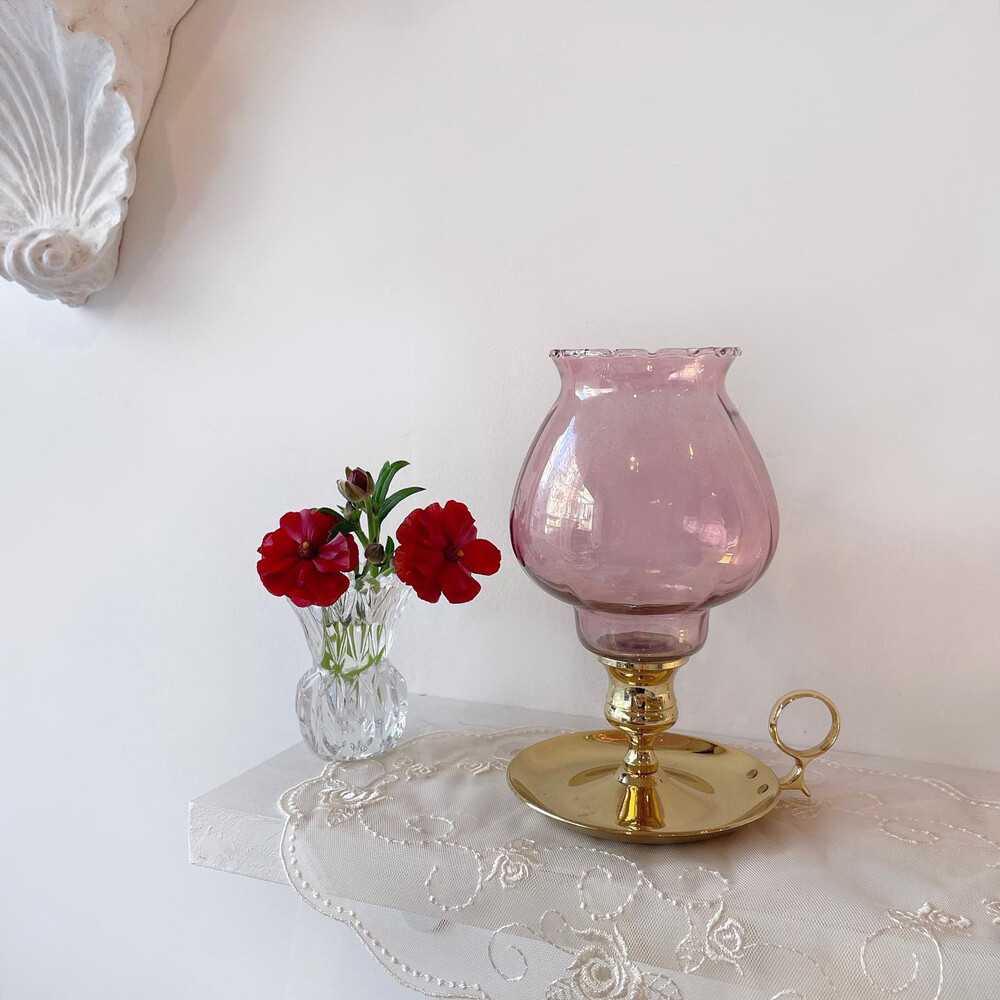 핑크 오팔빛 보티브와 브라스 손잡이 촛대 세트입니다.