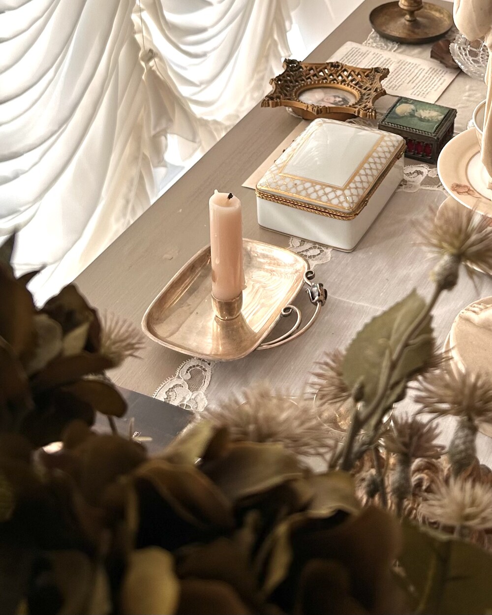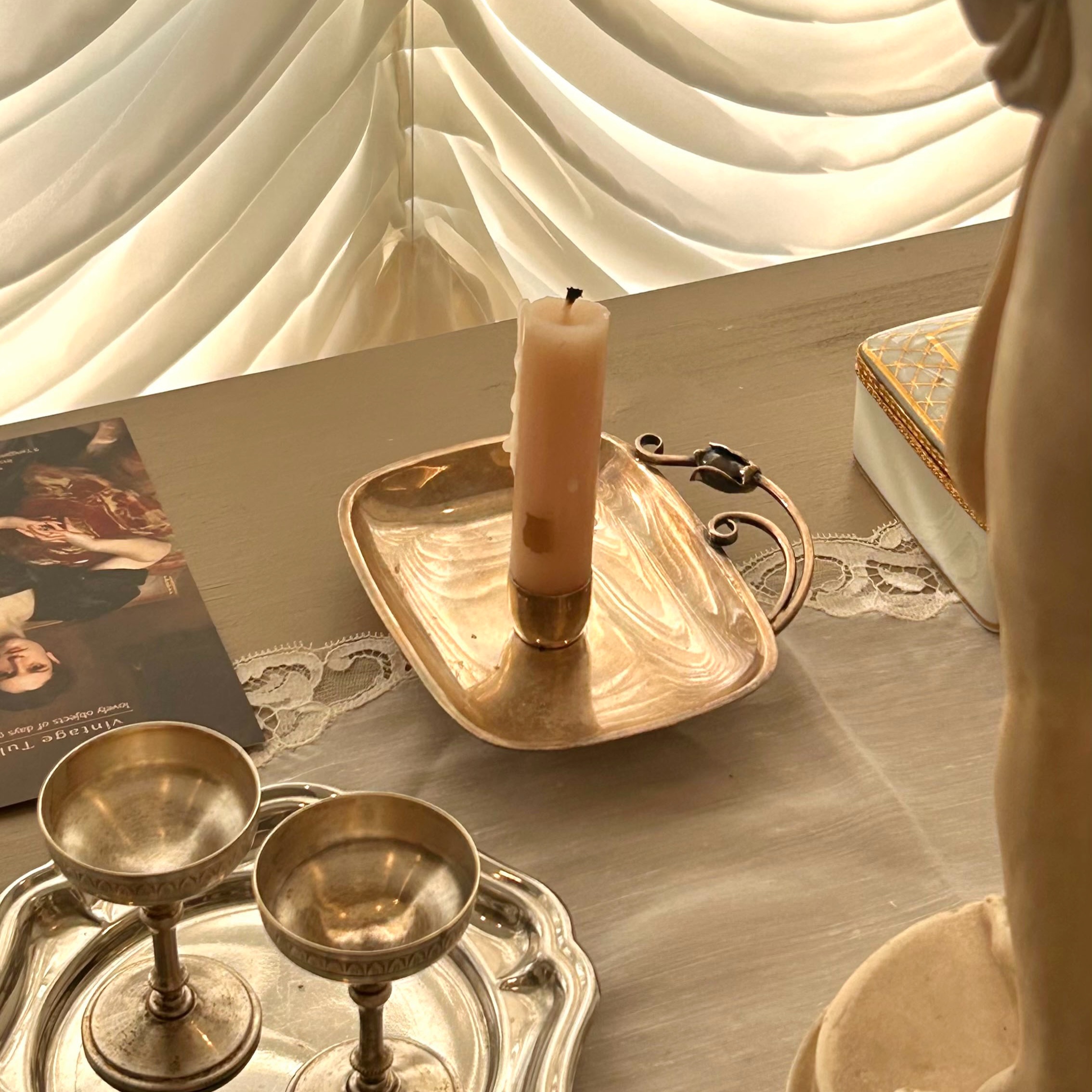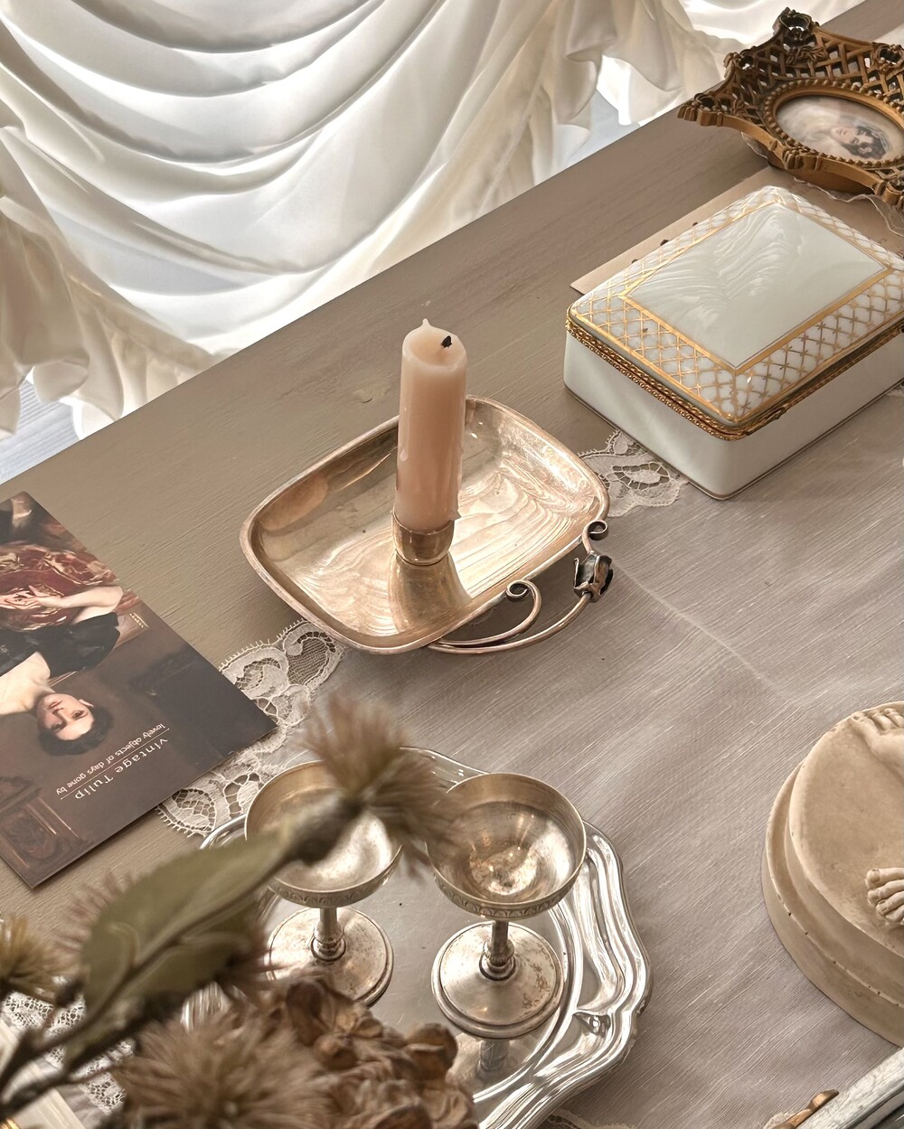 한쪽에 단정히 놓인 튤립 모양의 손잡이가 아름다운 촛대입니다.