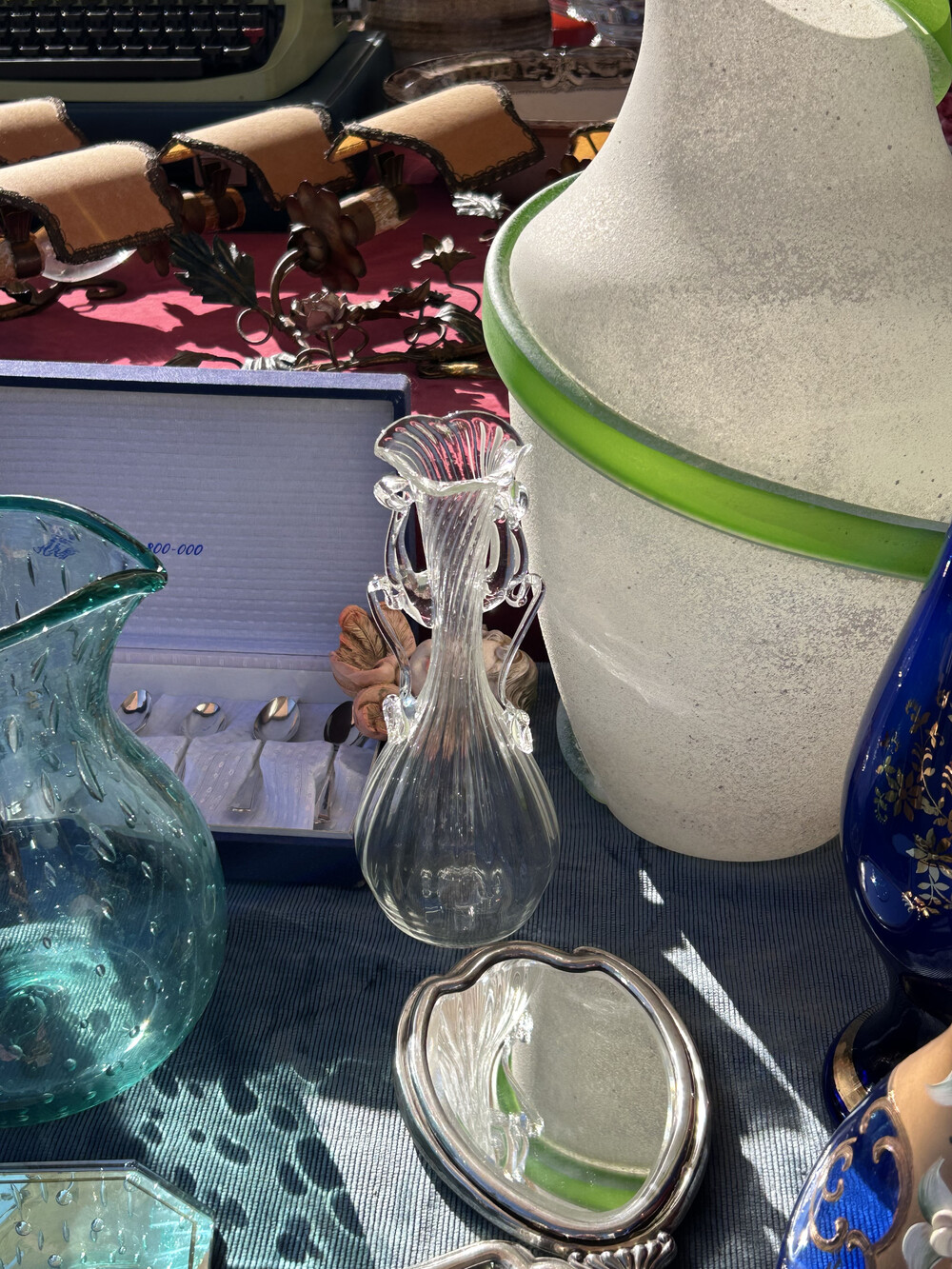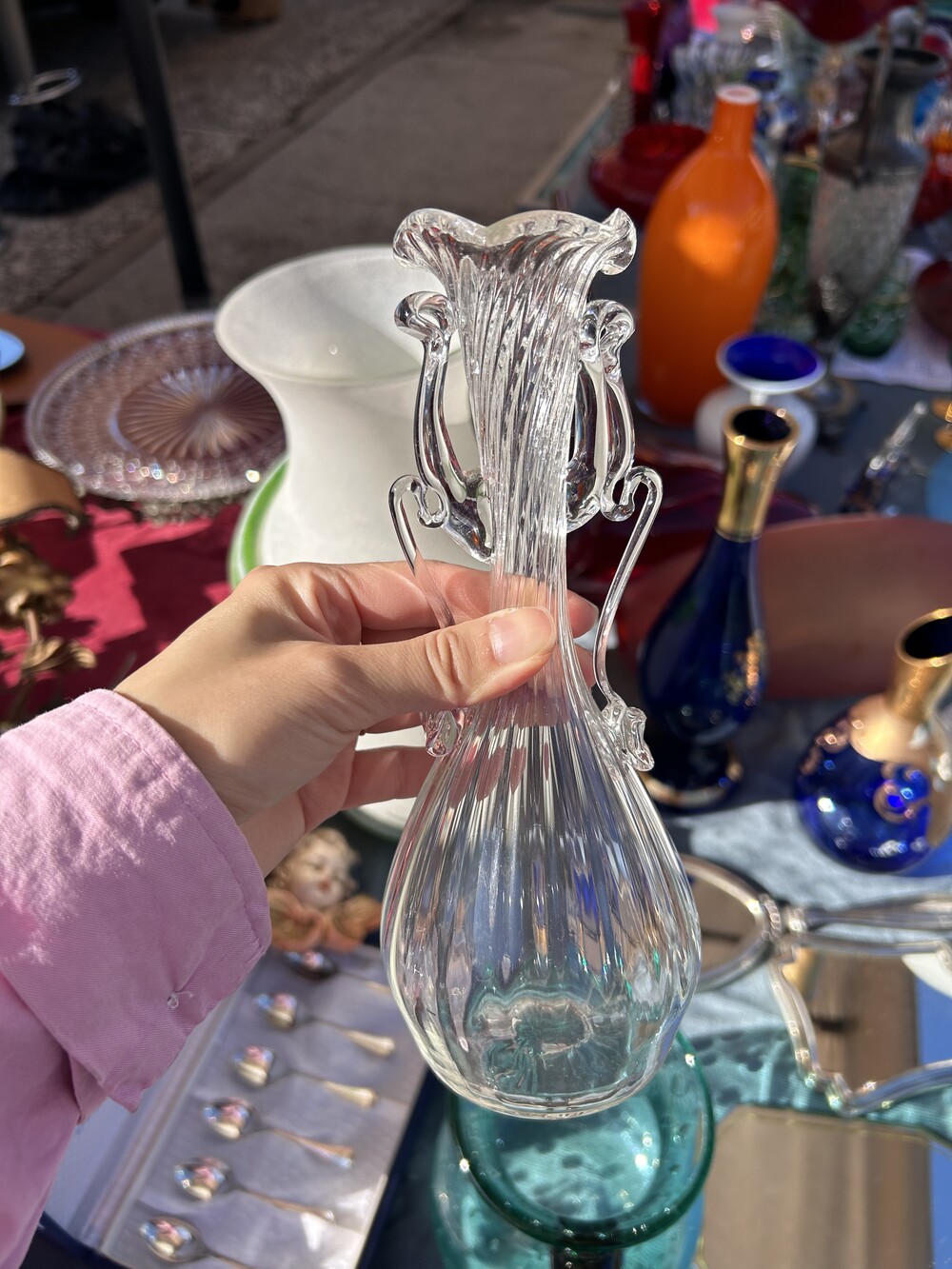 양쪽에 붙은 조형적인 핸들이 아름다운 빈티지 무라노 아트글라스 화병입니다.
