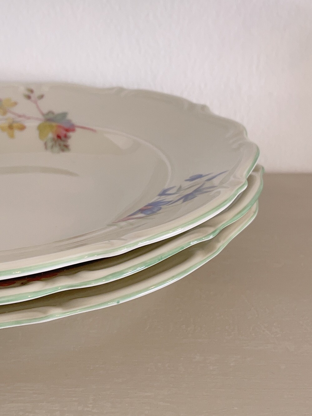 포근한 베이지 바탕에 민트그린 컬러의 테두리가 둘러진 흔치 않은 디너 플레이트 입니다.